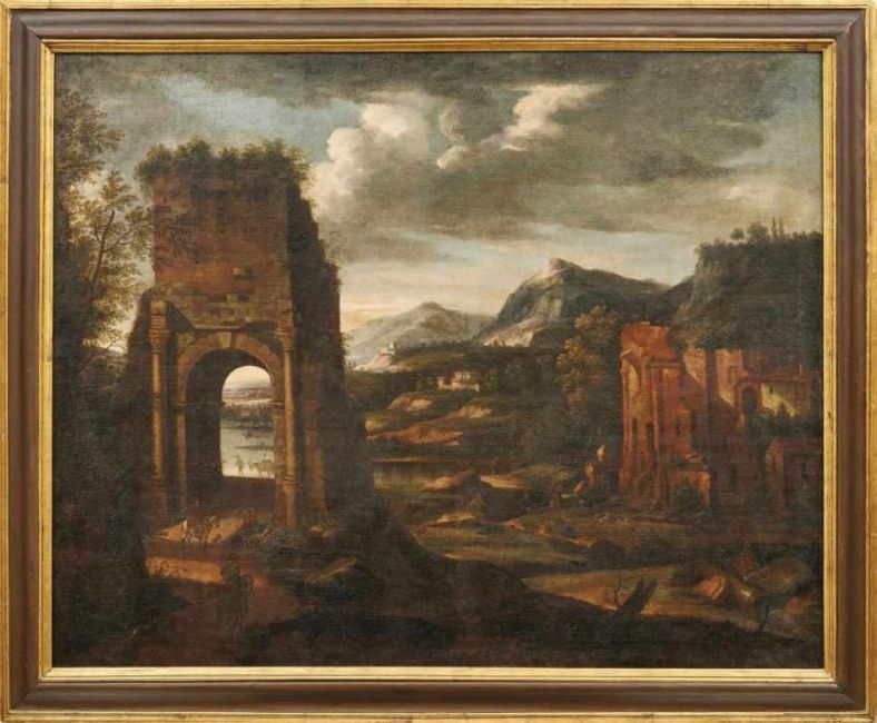 Around 1690-1700. Southern landscape with villages on the hills and in the ruins of