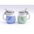 Blauer bzw. grüner Schablonendekor mit Vögeln in Blattranken. Porzellan mit Zinndeckel.