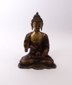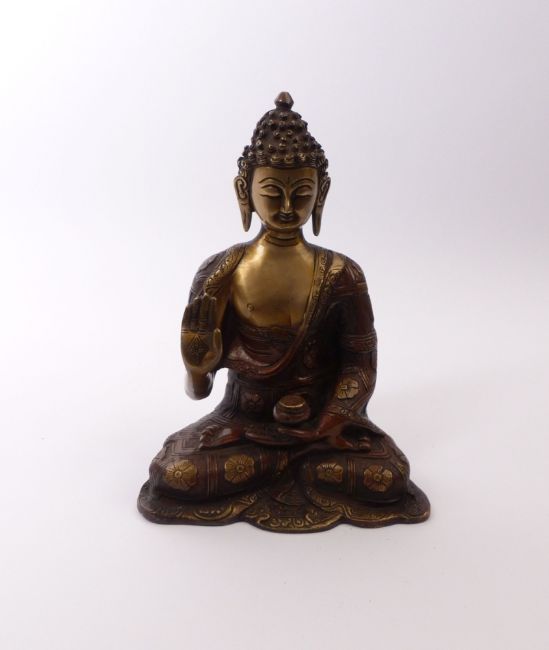 Gestus der Ermutigung (Abhaya Mudra), in der linken die Schale haltend. Bronze mit